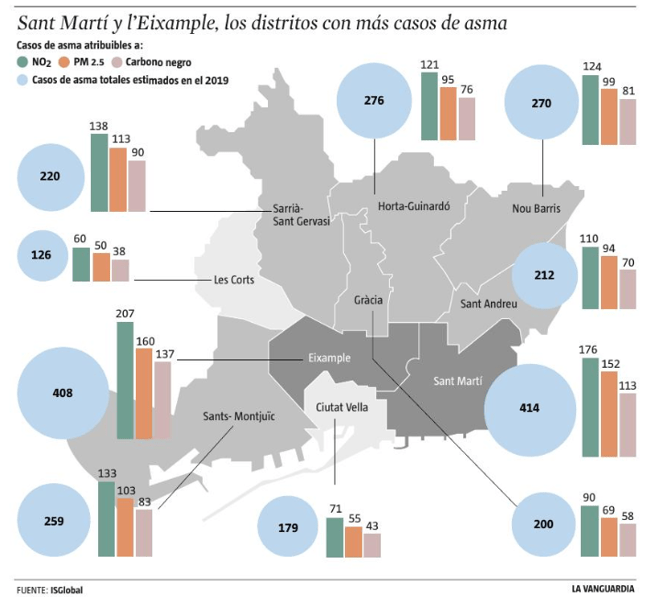 Es la conclusión de un estudio de ISGlobal , centro impulsado por la Caixa, que ha cruzado los datos de casos de asma infantil nuevos y la presencia durante el mismo periodo de tres componentes de la contaminación atmosférica: dióxido de nitrógeno (NO2), partículas finas en suspensión (PM2,5) y carbono negro (lo negro que emiten los tubos de escape, un fiable indicador de tráfico). Todo eso distribuido por las distintas zonas de la ciudad y su definición socioeconómica. Pretenden así determinar en qué medida inciden las privaciones socioeconómicas en el desarrollo de la enfermedad.