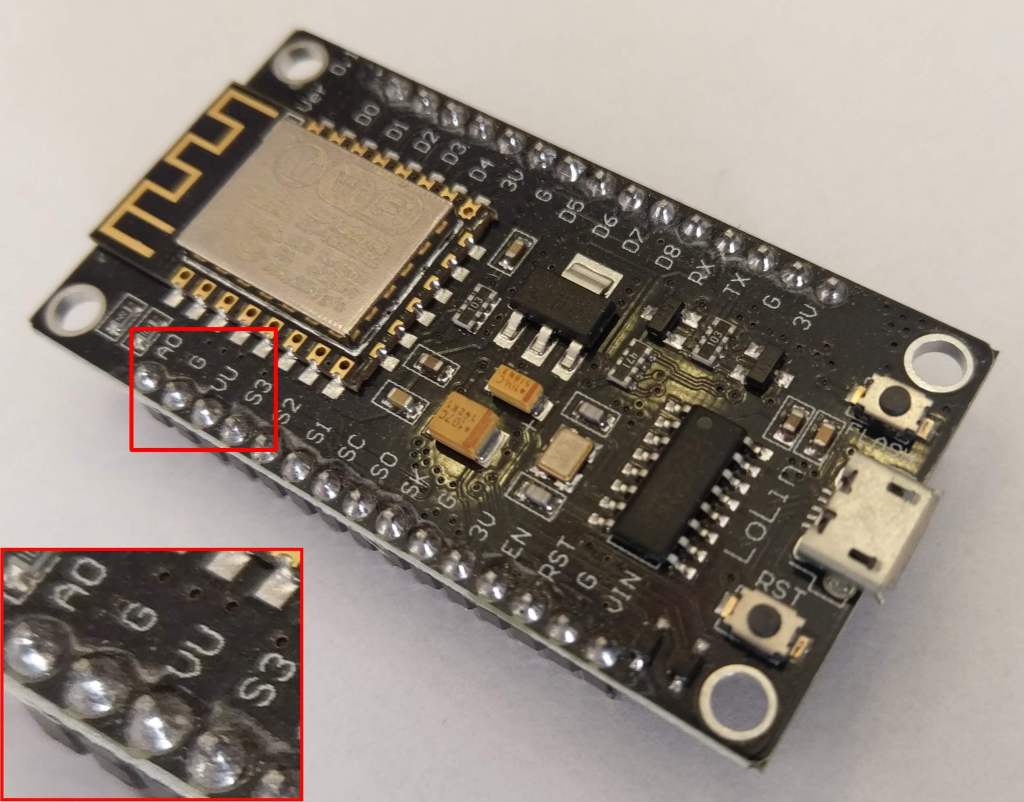 NOTA: Las instrucciones que siguen a continuación, se refieren a la versión 3 (V3) de NodeMCU. Para confirmar que la versión de tu placa NodeMCU es V·, mira si la serigrafía de los ponis de tu placa coinciden lo que muestra la foto pequeña que aparece al principio de estas instrucciones, es decir, si aparecen las conexiones VU y G.
